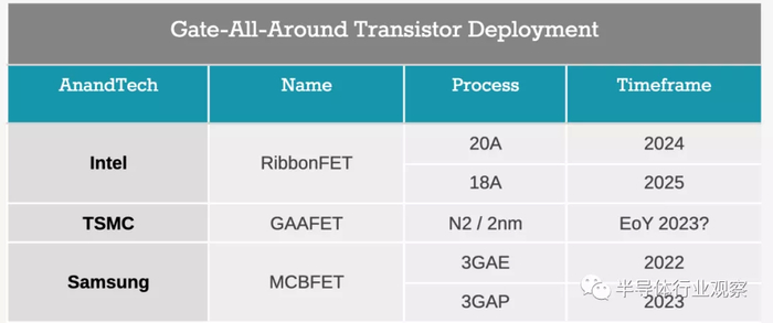 按照这个指标,三星可能是第一个迈入GAA大门的,尽管有内部节点,而台积电将首先从 N5、N4 和 N3 节点中获得很多收益。大约来到2023 年底,一切会变得有趣,因为台积电可能会考虑其 N2 设计,而英特尔则致力于 2024 年的时间框架。官方幻灯片显示 2024 年上半年,尽管作为技术公告与产品公告,两者之间通常存在一些滞后。