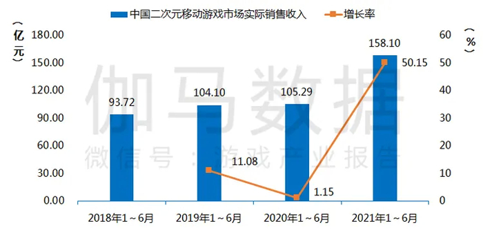 2021年1~6月中国二次元移动游戏市场实际销售收入达到了158.10亿元,同比增长了50.15%。