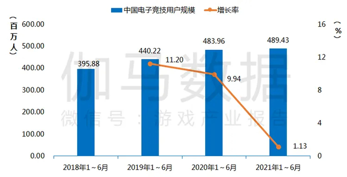 2021年1~6月中国电竞用户规模为4.89 亿人,同比增长1.13%。