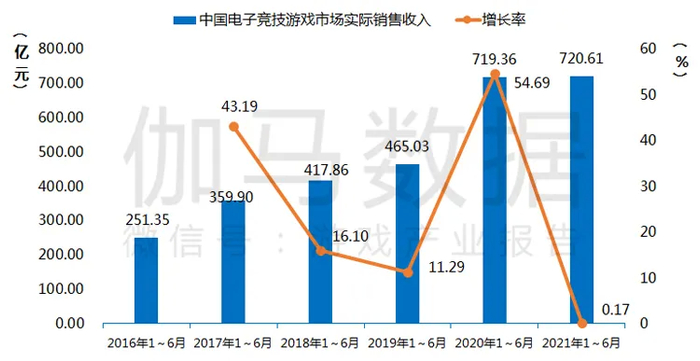 2021年1-6月中国电子竞技市场:收入720.61亿元 同比增0.17%