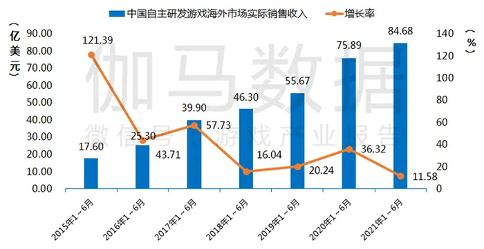 2021年1~6月,中国自主研发游戏在海外市场的实际销售收入达84.68 亿美元,同比增长11.58%,增速高于国内市场。
