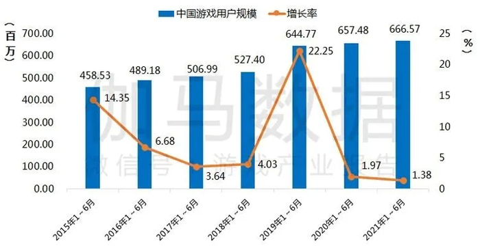 2021年1~6月,中国游戏用户规模近6.67亿人,同比增长1.38%。