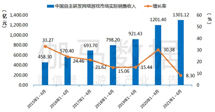 2021年1~6月,中国自主研发游戏国内市场实际销售收入达到1301.12亿元,同比增长8.3%。