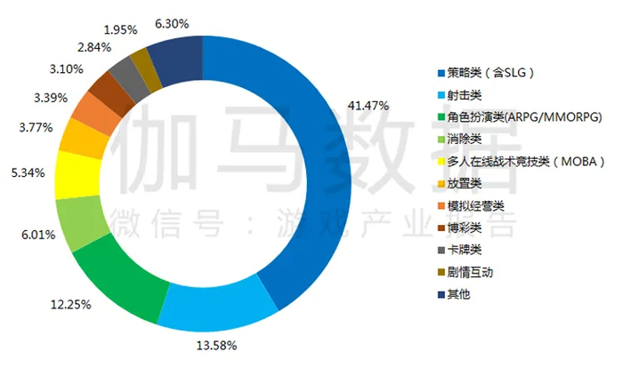 出海移动游戏中策略类、射击类、角色扮演类游戏最受欢迎。策略类达41.47%,遥遥领先于其余类型。