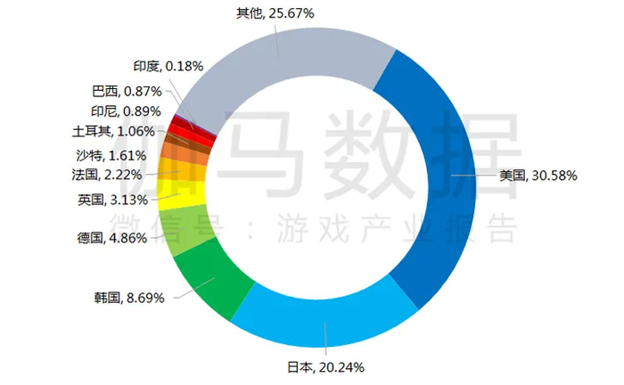 中国自主研发移动游戏出海市场收入排名前5的地区分别是:美国、日本、韩国、德国、英国。其中美国超过三成,日本超过两成。