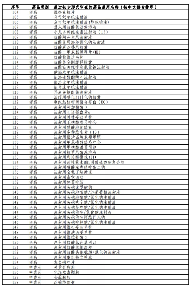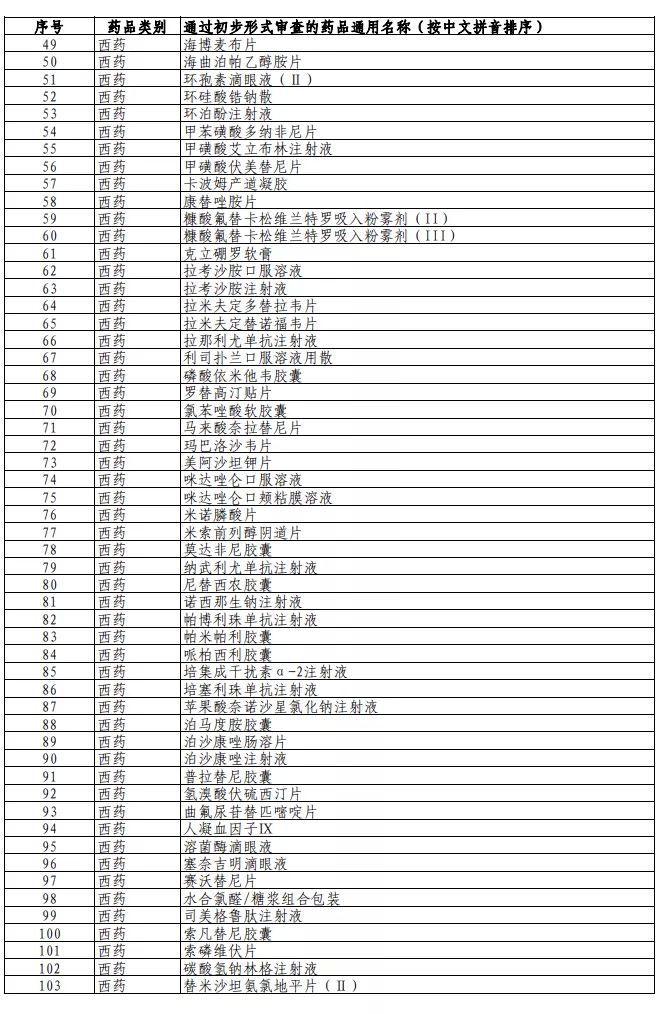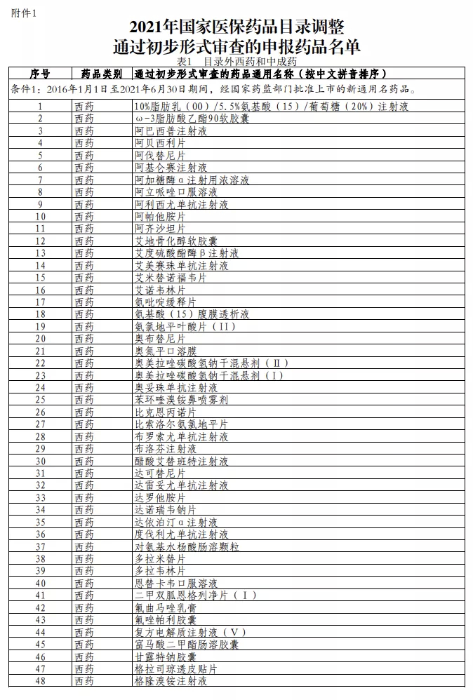 以下为2021年国家医保药品目录调整通过初步形式审查的申报药品名单: