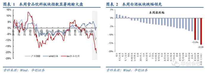 受高估值背景下市场心态不稳和资金面因素影响,以白酒板块为代表的食品饮料板块显著回调。受中报预期、政策传闻等影响造成市场情绪不稳,以及外资流出影响,本周食品饮料板块估值大幅回调,本周食品饮料板块整体、白酒板块指数跌幅分别达13.0%、15.9%,跌幅居全行业前列。