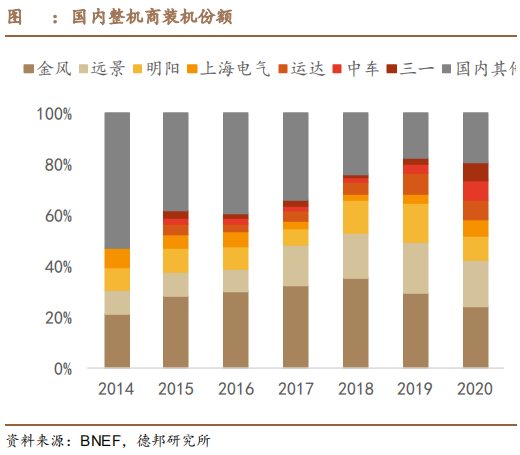 国内市场整机前三为金风、远景、明阳,2020年全球市占率为14%、11%和5%。2020年由于抢装,国内龙头主机厂商产能不足,集中度呈现一定程度下滑。