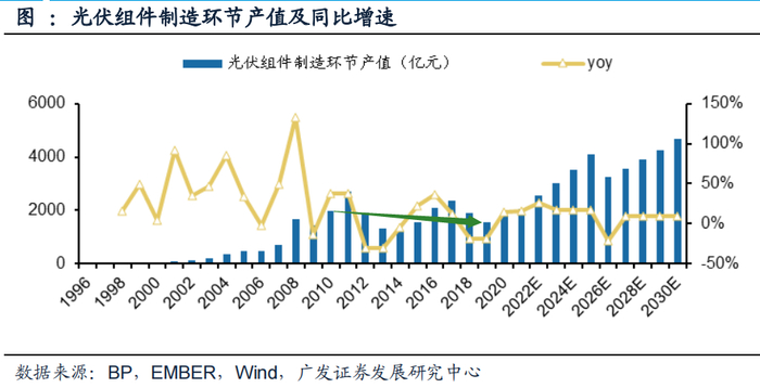 光伏可以有多卷?以组件环节为例,十年产量7倍,产值却是下降的。