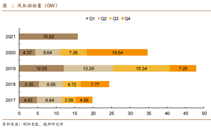 且招标情况大幅好于预期。20 Q4、21 Q1分别新增招标16.54、15.82 GW,成为历史招标量最大的两个季度,预计21全年招标45 GW,同比增长29%。