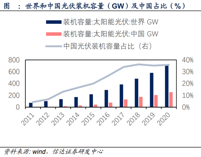 十三五期间国内光伏单年新增装机屡创新高,累计装机从2015年的43GW翻了6倍,2020年底达到254GW,占全球装机容量的36%。