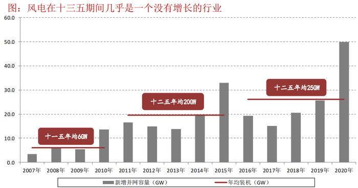 十三五期间风电年均装机量几乎没有增长。如果没有20年的抢装刺激,年均装机量几乎可以持平十二五。