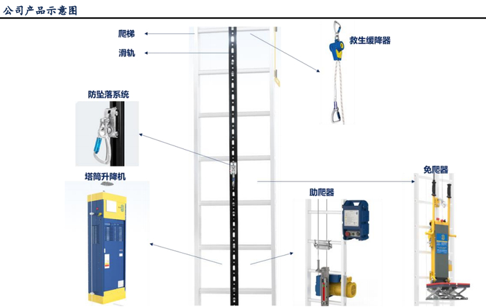 产品大类别分为高空安全升降设备和高空安全防护设备,前者包括塔筒升降机、免爬器、助爬器等,后者主要包括防坠落系统、救生缓降器、爬梯、滑轨等,需要与升降设备配套使用。