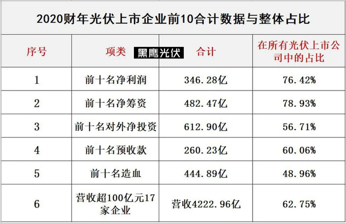 此外,从企业经营层面观察,“强者恒强”的马太效应愈发凸显,巨头占比正在快速提升,产业各种变数与矛盾叠加下,企业经营状况分化严重。比如,黑鹰光伏统计发现,过去的2020财年,在百家光伏上市企业中,前十营收、净利、筹资等比重均持续提升。
