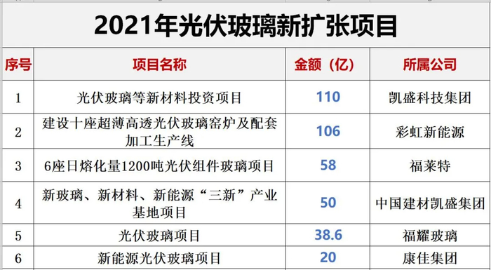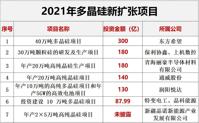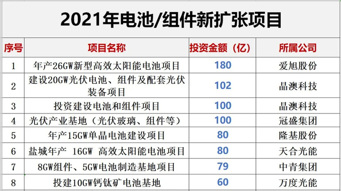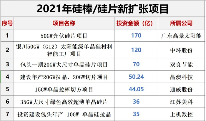 到了2021年至今,光伏产业链的扩产更为凶猛。我们看看2021年的一些扩产数据: