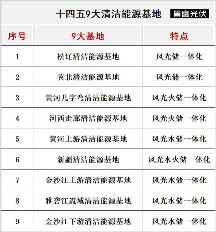 对于新能源产业而言,特别值得注意的另一个规划还包括《中华人民共和国国民经济和社会发展第十四个五年规划和2035年远景目标纲要》,文件指出,中国在十四五期间将重点发展九大清洁能源基地和四大海上风电基地。可以确定,其一,开发主体必然是以国资为主;其二,储能在这些基地中将扮演不可或缺的角色,如下表: