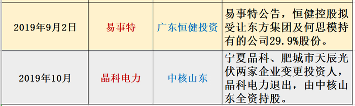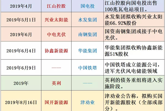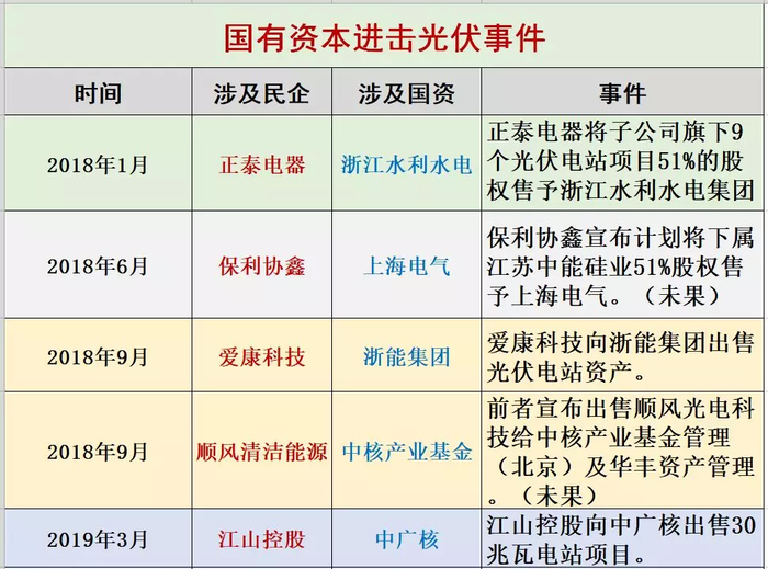 第二个节点,是2018年光伏“531新政”背景下,很多民企陷入经营困境,国资加速入局。彼时银行对民营企业贷款收紧,使得民企资金压力进一步增大,不得不寻求国资接盘。大家应该都有记忆,从2018年“531”至2019年,光伏领域出现了大量国资进击光伏的事件,如下: