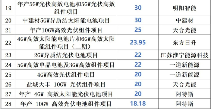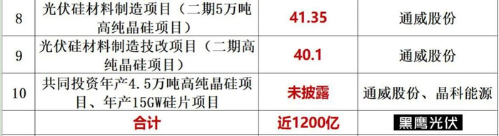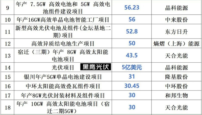 黑鹰光伏还发现,在过去的一年里,前十大光伏投资项目中还出现了新面孔,比如第五名的广东高景太阳能科技有限公司的“50GW光伏大硅片项目”,该项目计划投资170亿元;还有*ST海源的“10GW高效光伏电池和10GW高效组件生产项目”,项目投资预算为105亿元。