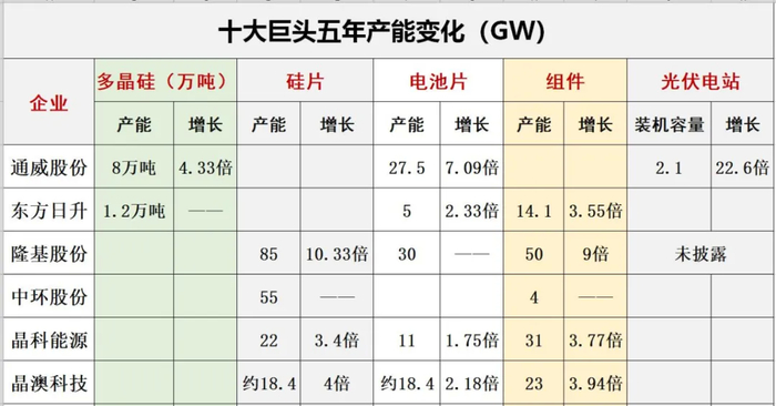 多晶硅环节:五年间,通威股份多晶硅产能增长了4.33倍,新进玩家东方日升目前多晶硅产能也达到1.2万吨。