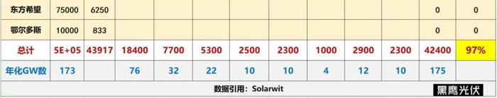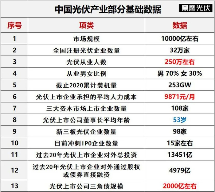 这一直是一个“剩者为王”的行业,先进技术代替落后技术,高性价比产品代替低性价比产品,有竞争力的公司干掉失去竞争力的公司。而且由于光伏设备处于不断更新进步过程中,单位产能的投资额度必然会处于越来越小的趋势当中,光伏的“喜新厌旧”也成为必然。下表是黑鹰光伏年初制作的中国光伏产业的部分基础数据,其中光伏企业总市值目前为“35000亿左右”: