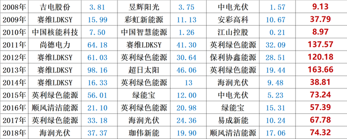 光伏产业确实是十年河东河西,曾经风光无限的企业,也完全有可能陷入亏损泥潭,甚至破产倒闭。如下表,在过去20十年里,一些明星企业也曾出现在“亏损前三”的名单中。产业的残酷,经营的分化,都可见端倪。