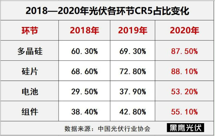 现在光伏的竞争格局依然是群雄逐鹿,一方霸主。硅料环节如通威、协鑫、大全、特变和东方希望;硅片环节如隆基、中环+各路竞局者;电池片如通威、爱旭、润阳;组件如隆基,天合、晶澳、晶科、阿特斯;逆变器环节如华为和阳光电源,光伏玻璃环节的信义光能和福莱特;金刚线如美畅股份、易成新能等,光伏支架如中信博和国强等。