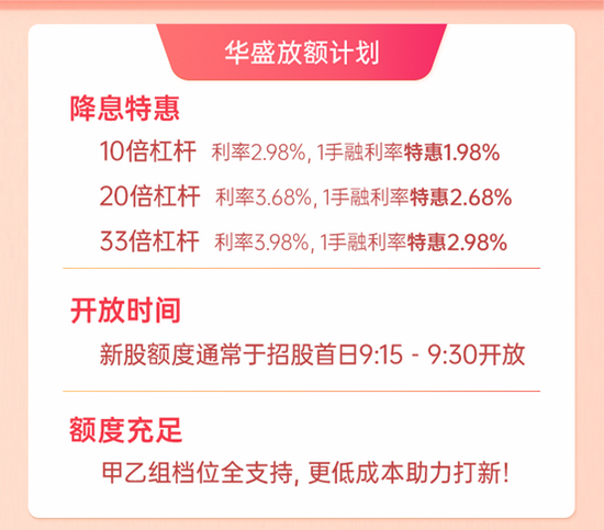 华盛推出“壕”华新股放额计划,33倍杠杆全员开放!融资利率低至1.98%起!点此马上预约33倍融资打新额度>>