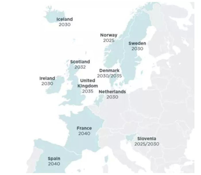 欧洲各国直接出台燃油车禁售时间表来降低能源消耗和碳排放。2021年7月14日,欧盟委员会提出一项立法建议,拟从2035年开始在欧盟市场内禁售使用汽油或柴油内燃机的传统能源汽车,目的是到2030年将汽车产生的二氧化碳排放量减少55%,到2050年实现碳中和。