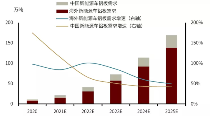 图表:全球铝汽车板需求增加主要受益于新能源车需求放量
