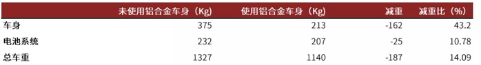 铝汽车板替换后减重效果显著,整车可减重10%。汽车车身约占汽车总重的30%,其覆盖件使用材料主要是钢板,如果用铝合金来代替传统钢板,可使白车身减重约40%-50%,进而使整车减重10%左右。