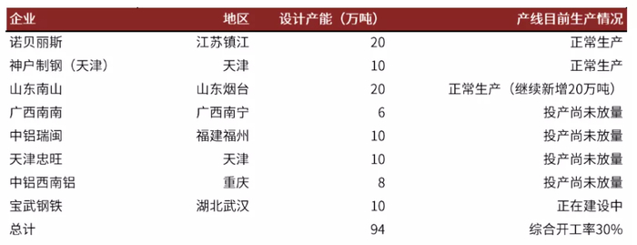 图表:截至2020年国内主要铝汽车板生产企业产能及产线情况