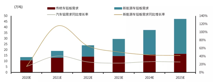 我们预计2025年国内铝汽车板需求将提升至47万吨,2020-2025年CAGR为28%,其中新能源车铝板需求达到31万吨,2020-2025年CAGR为61%,国内汽车板市场迎来高速成长契机。