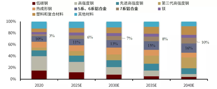 汽车轻量化可以显著降低能源消耗。随着对环保和节能的迫切需要,燃油车需要降低油耗、减少废气、提高效率;新能源电动车需要降低电耗,减轻质量来提高续航里程来提高竞争力,铝合金替代钢铁材料是各大汽车厂商采取的主要减重手段之一。汽车质量每减轻10%,可节省燃料消耗6%-8%,减少碳排放10%;如果每辆轿车减重100kg,那么行驶100km可减少油耗0.48L,明显的减重节能效益使汽车铝材的用量与日俱增。据美国汽车研究中心预测,未来铝合金在汽车上的综合占比将从2020年占比13%提升至2040年26%。