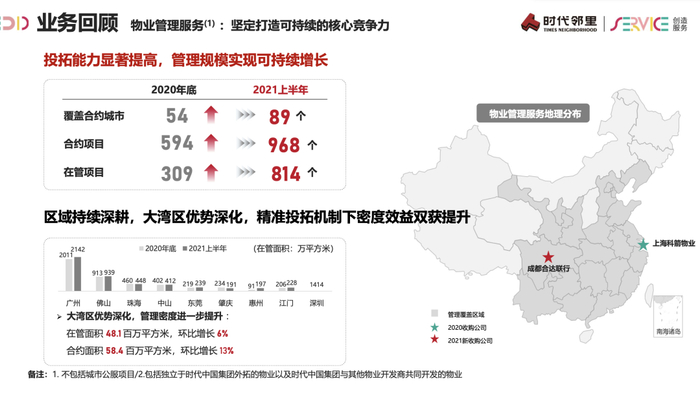 公司内部有贯穿投资前中后的管理体系,一方面推动收购标的融入时代邻里,另一方面让时代邻里的服务标准及平台植入到标的中。公司对投后管理的效果逐渐彰显,上海科箭上半年新增481万方面积,在拓展原有的华中地区布局外,在大湾区也有一些新的项目;成都合达在并表之后获得80万方新增业务,合达与当地公司组成合资公司,锁定280万方合约面积。