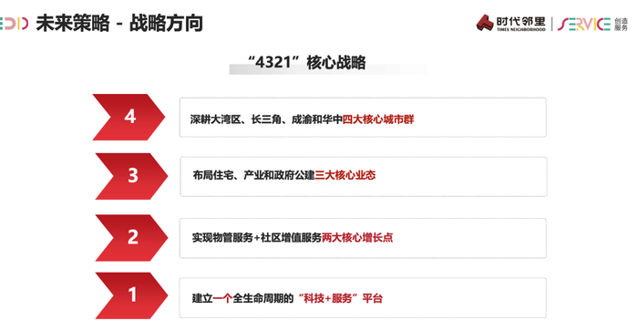 白锡洪答:时代邻里在物业板块中属于中等规模的企业,是一家有特色的物业企业,主要体现在三方面,1)主要业务集中于粤港澳大湾区,在管面积约60%都集中于大湾区,在大湾区里面时代邻里是龙头物管企业;2)时代邻里重点布局住宅、产业园和公建的三大业态,住宅占的比例达到五成以上。上海科箭在工业物流中约占25%市场份额;3)时代邻里积极开拓新的业务领域,且持续关注开发新业务的可持续性。时代邻里未来也会重点发展城市公服的领域。面对市场不可确定性,在未来时代邻里会坚持“4321”的核心战略,在四大核心地区,布局三大核心业态,打造两大核心增长点,建立一个以“科技+服务”的核心平台。应对行业变化时,时代邻里会持续关注思考,提升智能化、信息化。