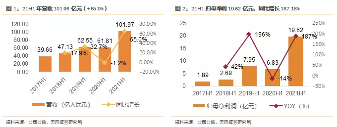 1、21H1营收101.96亿同增64.97%,归母净利19.62亿同增187.18%