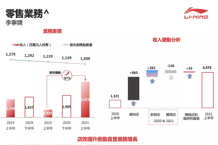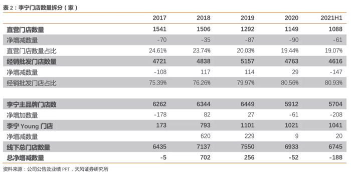 2)李宁YOUNG:截至2021年6月30日,李宁YOUNG拥有门店1041家,相较年初净减20家。