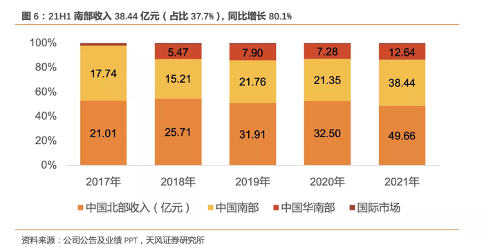 21H1北部市场收入49.66亿元(占比48.7%),同比增长52.8%;南部收入38.44亿元(占比37.7%),同比增长80.1%;华南部收入12.64亿元(占比12.4%),同比增长73.6%;国际市场收入1.22亿元(占比1.2%),同比增长78.3%。