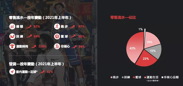随着品牌力、产品力不断升级,国内对国产品牌的持续关注,在2021上半年,集团5大核心品类的全平台零售流水获得92%的强劲增长,其中运动时尚品类表现突出,达到了116%零售流水增长。跑步品类明显发力,在增速上实现突破,达到87%零售流水增长。核心品类的增长带动了整个品牌的持续成长。