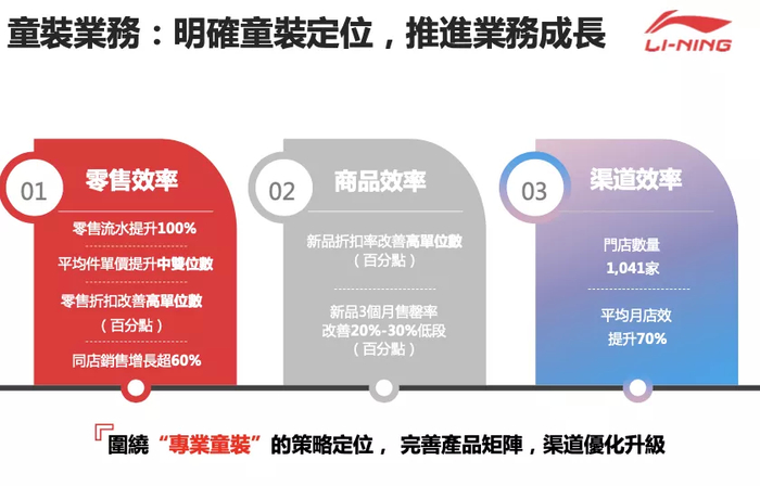 在期内,童装新品折扣率改善高单位数,当季售罄率改善20%到30%。进行自营店铺拓展,提升自营店生意占比,降低分销客户占比,开设童装形象店,提升高层级市场覆盖,关闭低效店,并进行形象升级,提高店铺效率引入零售型客户,淘汰低效客户,优化客户矩阵,在期内,童装门店总数达1041家,平均月店效提升70%。在未来,李宁将持续推进业务优化,加速建立可持续发展,可持续盈利的运营机制。