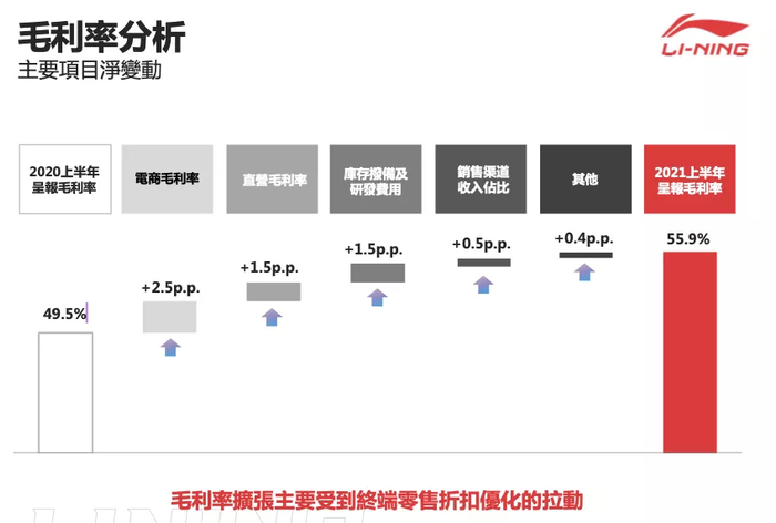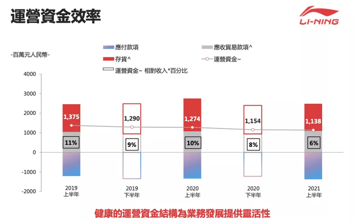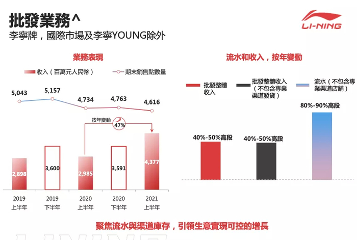 童装部分业务:基于李宁的优势,明确童装定位,围绕童装策略,持续提升产品力,并完善产品矩阵,同时围绕产品升级,优化渠道结构。上半年童装渠道流水体提升100%,平价件单价提升中单位数,零售折扣改善高单位数,同店销售增长超过60%。