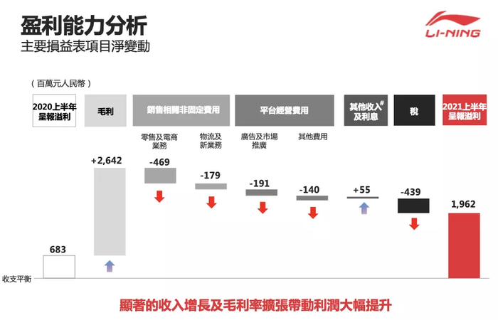 2021年上半年,中国经济逐渐回稳,国策助力体育事业发展,疫情带动群众健康意识增强,中国体育产业获得商机;同时国内消费者逐渐肯定国产品牌的科技、设计、质量等方面。这样的大环境下,李宁品牌围绕与生俱来的运动基因,强化产品科技与设计,不断释放市场潜力,深化升级李宁品牌的体验价值,深挖行业、市场的机遇。