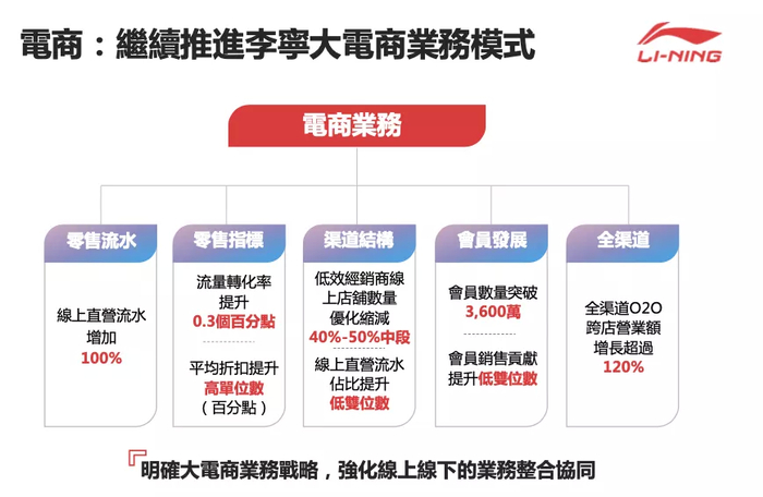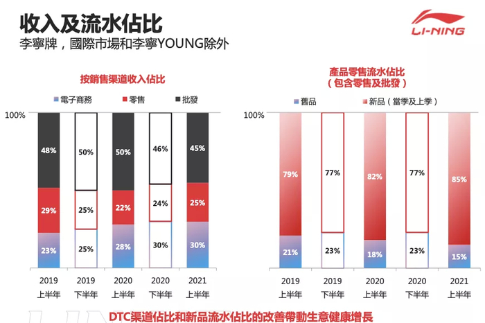 我们会继续推动李宁大电商商业模式的发展。我们能够指定唯一的渠道业务战略,以加强我们线上和线下业务的整合和协同。我们还加强了高周转产品销售模式,加强了我们的产品供应,降低库存风险以及提高我们的库存效率。上半年线上直营流水增长100%,流量转化率提升0.3个百分点,平均零售折扣率以高单位数百分比增长。