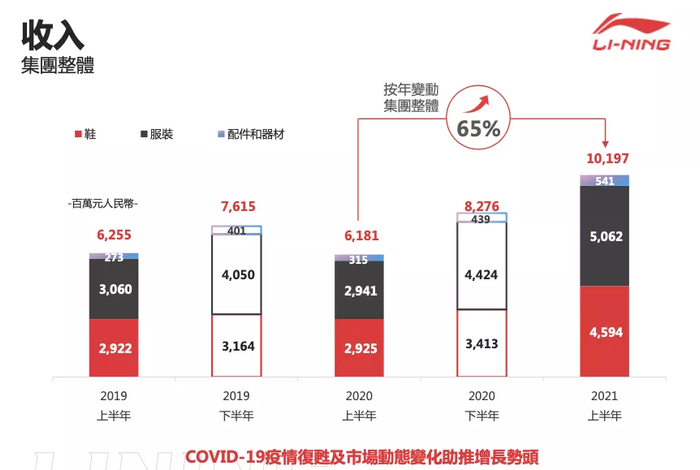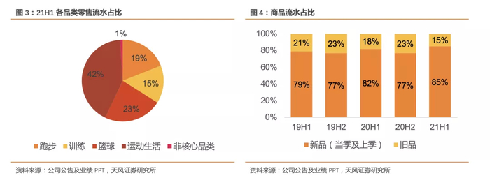 21H1鞋类收入45.94亿元(占比45.1%),同比增长57.1%;服装收入50.61亿元(占比49.6%),同比增长72.1%;器材配件收入5.41亿元(占比5.3%),同比增长71.8%。
