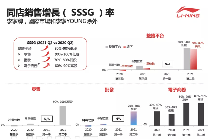 从流水看,21Q2李宁(02331)销售点(不包括李宁YOUNG)全平台零售流水按年实现90%-100%低段增长。就渠道而言,线下渠道(包括零售及批发)实现90%-100%低段增长,其中零售渠道实现80%-90%高段增长及批发渠道实现90%-100%低段增长;电子商务虚拟店铺业务实现90%-100%高段增长。此外,新品线下零售流水加速取得90%-100%中段增长。