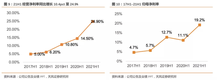 在毛利率显著增长,费用率减少的背景下,经营净利率同比增长10.4pct至24.9%,归母净利润率增长8.1pct至19.2%。毛利率增长、销售及管理费用率减少共同影响净利率高增。