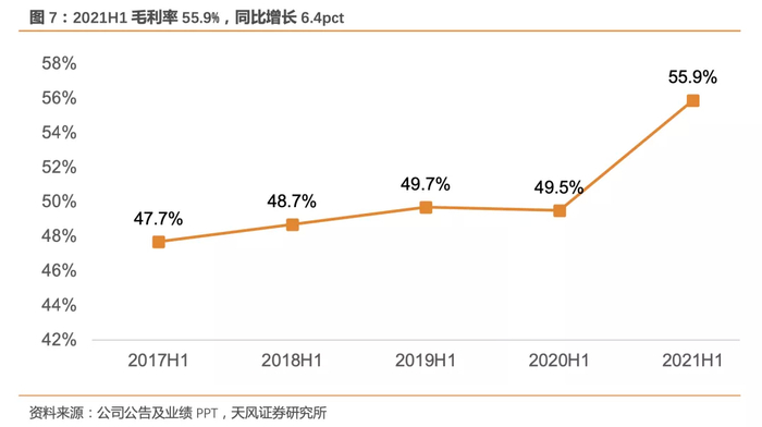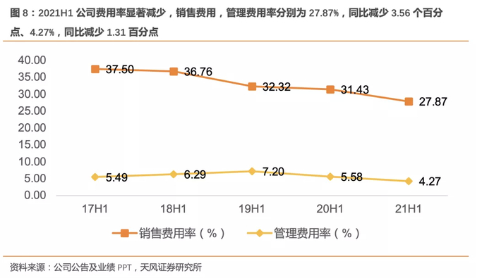2021H1公司费用率显著减少,销售费用,管理费用率分别为27.87%,同比减少3.56个百分点、4.27%,同比减少1.31百分点。