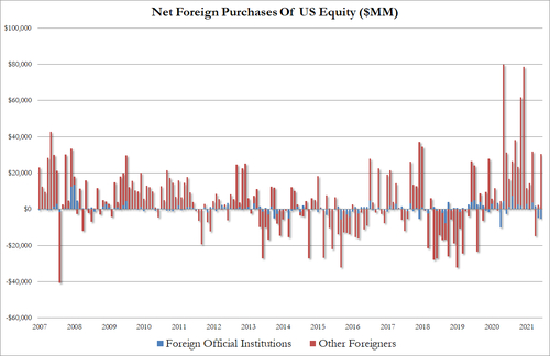 当月,外国人净买入长期美国国债109亿美元,净买入美国机构债务227亿美元,净买入美国公司债务138亿美元,净买入美股262亿美元,后者扭转了至少两个月净卖出美股的趋势,并创3月以来最大的股票买入潮,而且主力军是非官方的外国私人及机构。