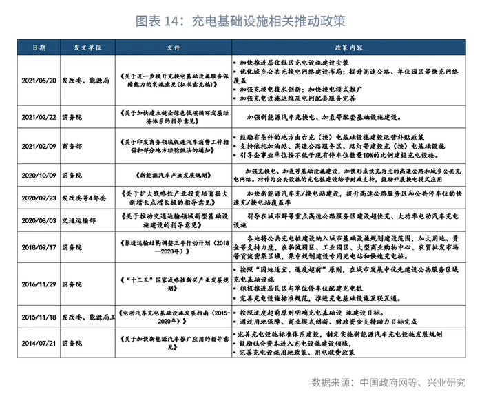 充电难问题始终是萦绕在新能源汽车身上挥之不去的难题。因此,要发展新能源汽车产业,也需要配套完善充电桩或换电等公共基础设施,以满足新能源汽车消费者的充电需求,切实提升居民对新能源汽车的使用体验。针对充电桩,政府亦出台了系列文件支持充电桩和换电产业的发展。