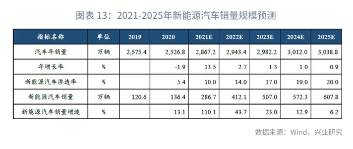 我们保守假设2025年新能源乘用车的渗透率达到20%,则到2025年新能源乘用车的销量将达到608万辆,2021-2025年间新能源车销量的年平均增速预计将达到34.8%。具体测算结果如下表所示。